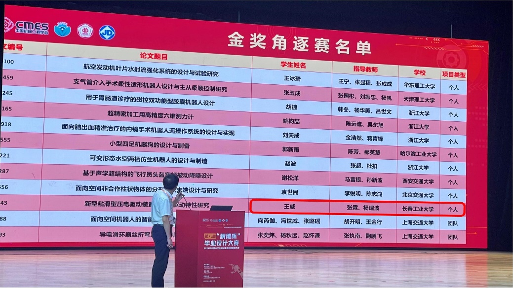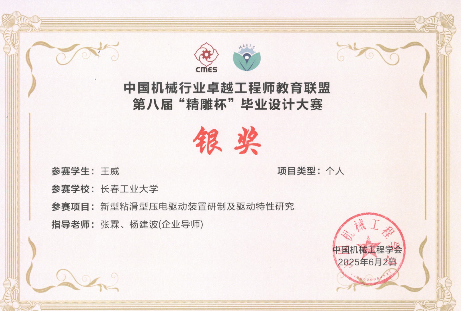 本网讯(通讯员 张霖)2025年6月2日,由中国机械工程学会、中国机械行业卓越工程师教育联盟主办,广东工业大学承办的2025年中国老员工机械工程创新创意大赛第八届“精雕杯”毕业设计大赛全国总决赛顺利举行。三亿体育王威同学的作品《新型粘滑型压电驱动装置研制及驱动特性研究》(指导教师:张霖、杨建波)荣获个人赛银奖(全国一等奖)。